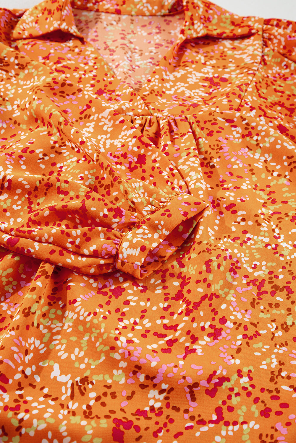 Orange Abstract Print Collared V Neck Babydoll Blouse